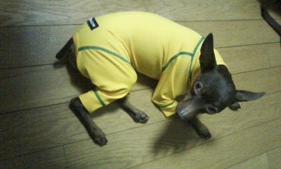 昨日は風が強かったので、お散歩のときに4つ足ウェアを着せてみました。