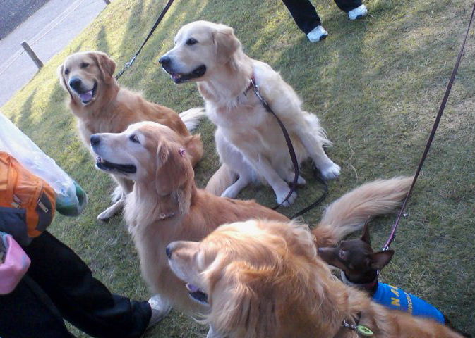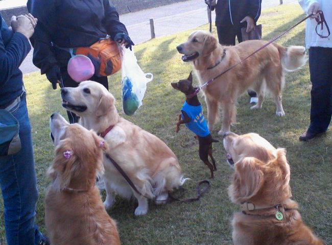 サスケ・マリン・チャチャ・ケン (ダックス)、レイア(アイリッシュセッター)、マーク(アメコカ)、トム(ミニシュナ)、ロン・ジュウザ (トイプー)、ジョニー(パピヨン)、エル・ジョイ(GR)、後から来たのは ジニー(MIX)、それにちょこらン。