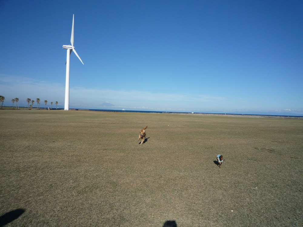 風車の右のほうに富士山が見えます。