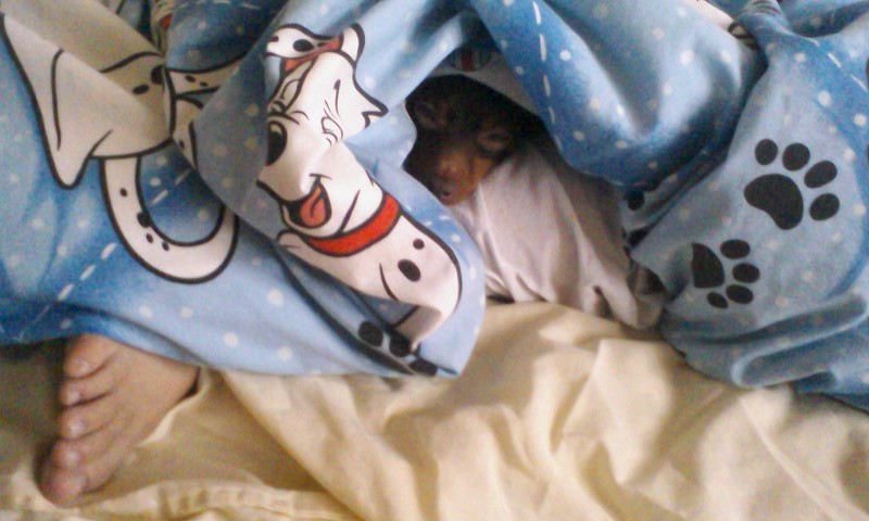 (寝るときはママは一人ですが、朝起きると必ずちょこらが一緒なんです。いつの間に・・・って感じです)