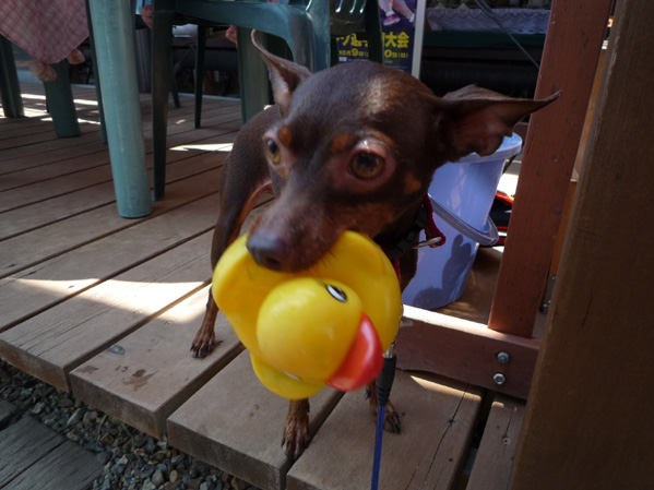 おもちゃのモグラ君を取ってこようと思ったら沈んでいっちゃってとれなくなっちゃったので、そこに浮いてたひよこ隊長さんをもってきました。