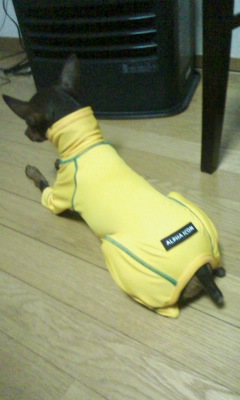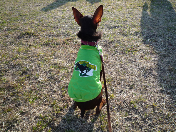 昨日は風が強かったので、お散歩のときに4つ足ウェアを着せてみました。
